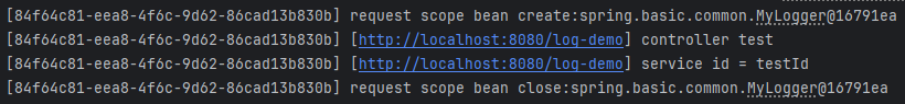 @Scope(value = "request")로 request 스코프로 지정하였기 때문에 이 빈은 HTTP 요청 당 하나의 인스턴스가 생성되고, HTTP 요청 종료 시 소멸된다. 빈 생성 시 @PostConstructor를 통해 UUID를 만들어서 저장하고, 빈 소멸 시 @PreDestroy를 통해 소멸 메시지를 남긴다. requestURL은 빈 생성 당시에는 알 수 없기 때문에 setter로 입력받는다.