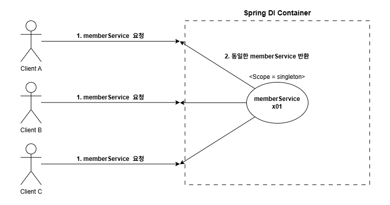 - 스프링 컨테이너는 본인이 관리하는 스프링 빈을 반환한다. (3개의 클라이언트 동일)