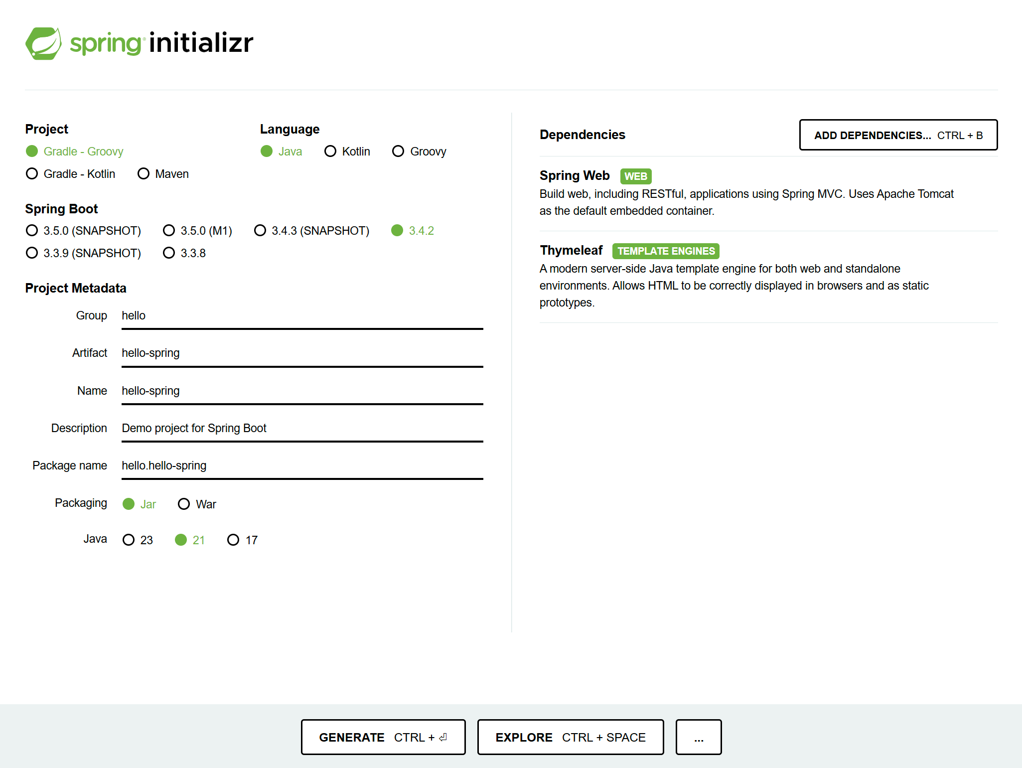 - Packaging : Jar (독립 실행형 애플리케이션) | War (웹 애플리케이션)