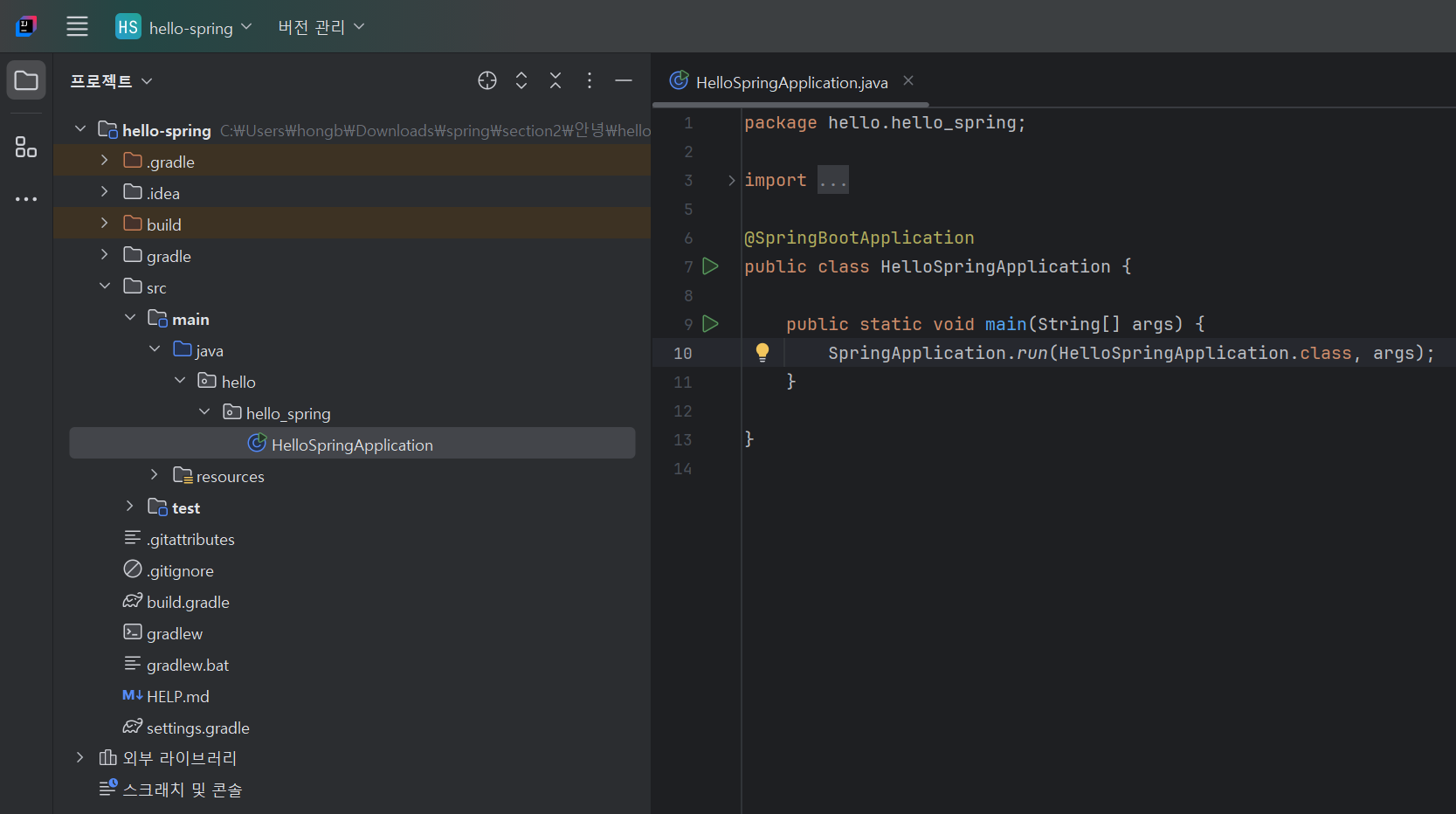 9번째 라인에서 main 메소드의 빌드 버튼을 누르거나, 윈도우 기준 Shift + F10로 프로젝트 빌드를 누른다.