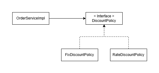 - 처음에 OrderServiceImpl 에서는 인터페이스인 DiscountPolicy와 구현 클래스인 FixDiscountPolicy를 의존